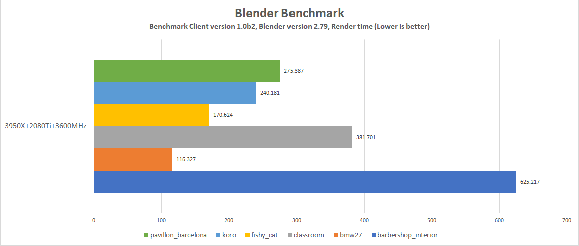 렌더링 시간을 기준으로 CPU 및 GPU 성능을 각각 체크할 수 있는 Blender Benchmark 테스트 결과이다. 각각의 씬 마다 렌더링에 소요된 시간은 각기 다르지만 16코어32스레드가 제대로 활용되 비교적 빠른 시간에 벤치마크가 완료되었다. 실제로 코어/스레드가 많지 않은 CPU를 활용할 경우 해당 벤치마크를 완료하는데 수십분에서 몇시간이 소요될 수 있다.