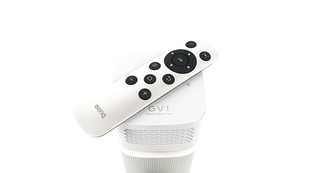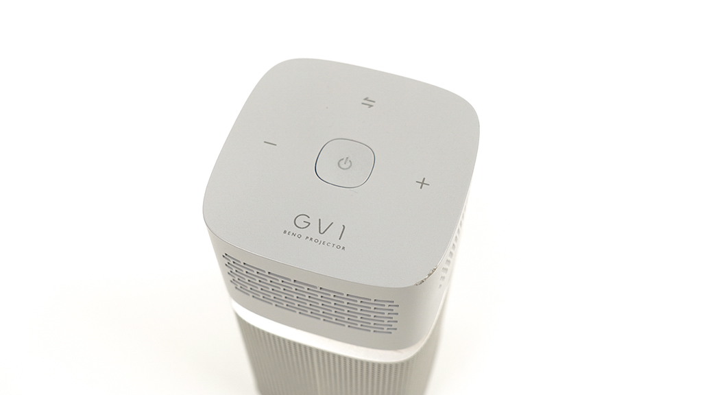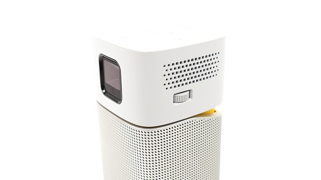 프로젝터 디자인은 상당히 귀엽다. 약간 로봇을 닮았다고 해도 무방한 디자인에 전체적으로 발열 해소를 위해 에어홀이 적용되어있다. 측면 초점 조절 다이얼을 돌려 초점을 조절하고 본체 내부에는 스피커도 내장되어 있어 별도의 스피커를 지참하지 않아도 된다.